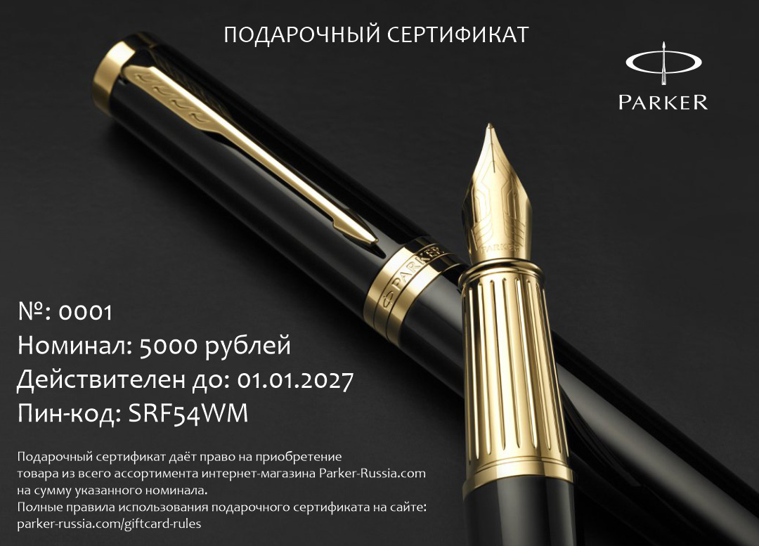 Подарочный сертификат Parker 5000 от официального дилера Parker в Димитровграде. Вы можете дополнительно заказать гравировку, которая подчеркнет Вашу оригинальность и придаст памятность статусному подарку. Все ручки Паркер поставляются в фирменном футляре.